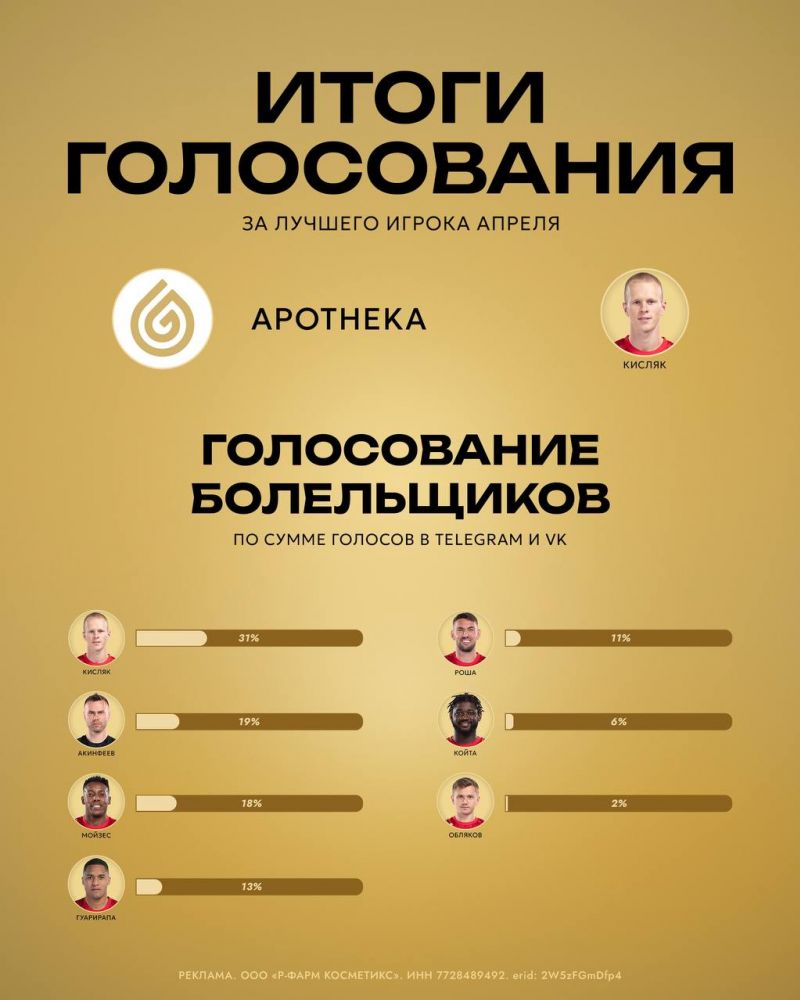 "Наш полузащитник стал лучшим в голосовании среди болельщиков, экспертов, а также получил свой голос от APOTHEKA. Поздравляем Матвея!" - говорится в сообщении.