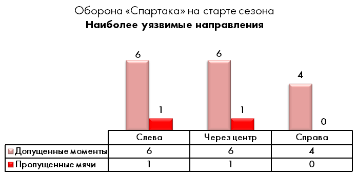 В векторном отношении чуть более надежно вроде бы выглядит правый фланг спартаковской обороны, но здесь необходимо сделать важную поправку. Дело в том, что отвечающий за это направление Ещенко допускал ошибки в 4 из 6 эпизодах с допущенными моментами после атак соперника через центр, так что зону между ним и правым центральным защитником можно считать наиболее уязвимым местом в оборонительной структуре красно-белых.